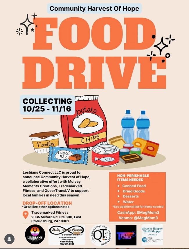 We asked the community to step up, and you showed up big time! We’ve already raised $370 and collected so many food donations at Saturday’s mixer. Let’s keep this going! No donation is too small. This will make a huge difference. Thank you! Community Harvest of Hope with Lesbians Connect We’re proud to announce Community Harvest of Hope, a collaborative effort with @mulveymoments , @trademarkedtanyamoves , @queertranslv , and @zionuccstroudsburg to support local families in need this season. Drop-off Locations: 📍 Trademarked Fitness Studio, @trademarkedtanyamoves owner of Trademarked Fitness, has generously offered her studio as a drop-off location: 2035 Milford Rd, Suite 600, East Stroudsburg, PA 18301 📍 Zion United Church of Christ Rev. Gary of Zion United Church of Christ has joined us in this food drive! 14 N. 8th St, Stroudsburg, PA 18301 🕘 Drop-off Hours: Monday–Friday, 9 AM–5 PM 🔔 During regular hours, please ring the bell outside the entrances. If dropping off after hours or on weekends, donations can be left on the side porches. If you’d like to send a monetary donation and have us shop for you, you can use: 💵 CashApp: $MegMom3 💳 Venmo: @ MegMom3 We’ll be collecting donations from 10/25 and continuing through 11/16. If you’d like to give donations directly to one of us, you don’t have to drive to Stroudsburg… this is a great opportunity to bring a few items and spread some love! 💛 We’re collecting: 🥫 Canned Goods • Green Beans • Corn • Cream of Mushroom Soup • Cranberry Sauce 🍞 Dry Goods • Instant Mashed Potatoes • Stuffing • Gravy Packets • Boxed Mac & Cheese • Rolls 🍰 Desserts • Mini Pies • Any Packaged Desserts 💧 Water Together, we can make sure everyone has something to be thankful for this season. 💛 #fooddrive #donate #snap #foodstamps
