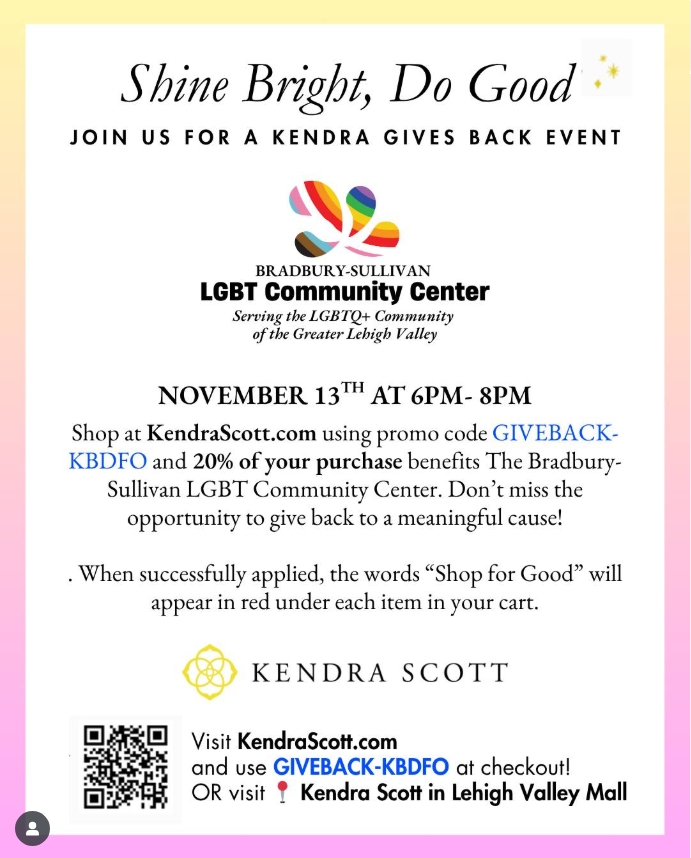 ✨🗓️ On November 13th 6:00pm – 8:00pm shop at KendraScott.com using promo code ‘GIVEBACK-KBDFO’ and 20% of your purchase will benefit the Bradbury-Sullivan LGBT Community Center.